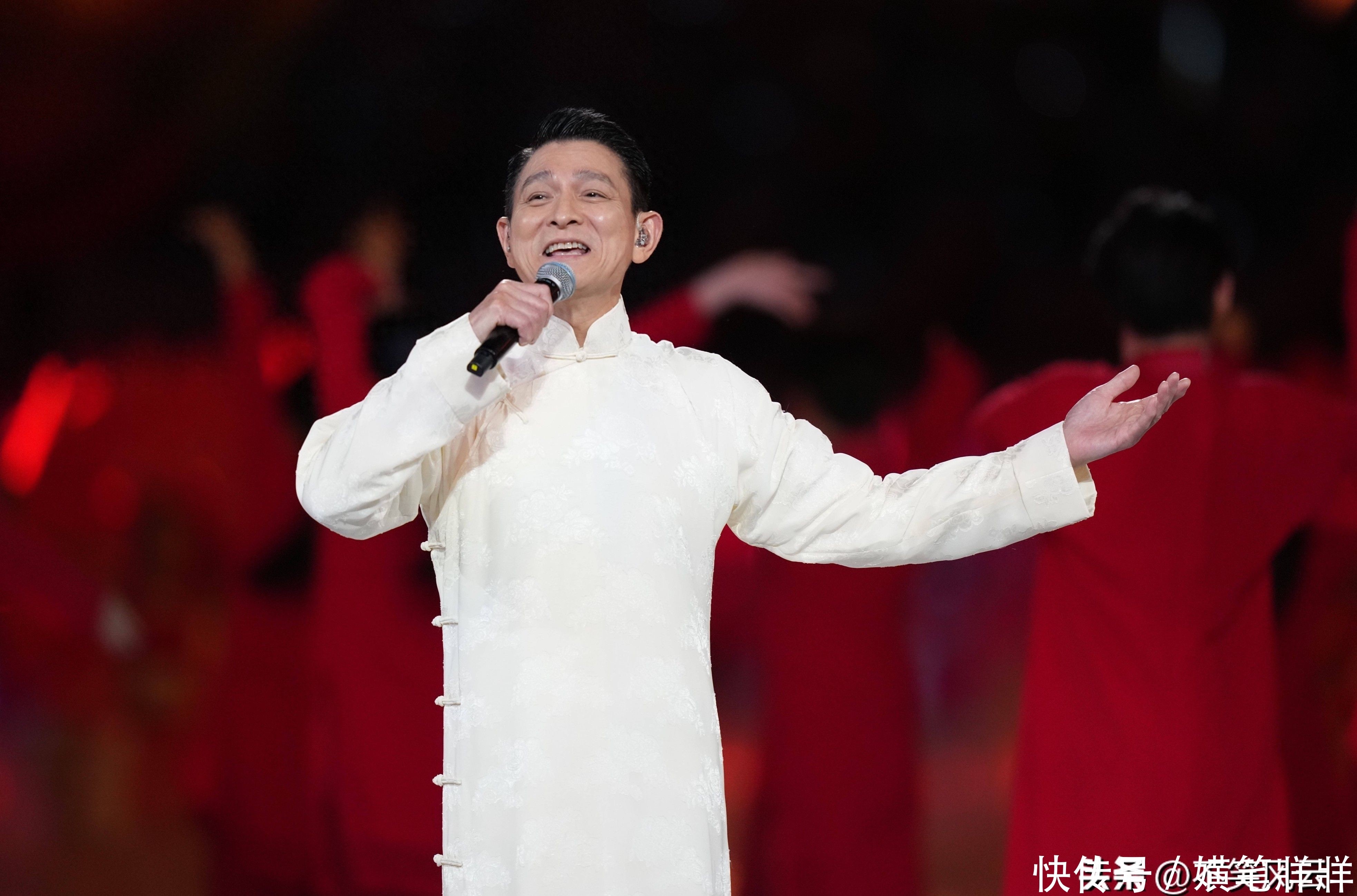 刘德华身穿白色唐装压轴亮相,64岁的他在聚光灯下依然目光如炬,气宇轩昂。